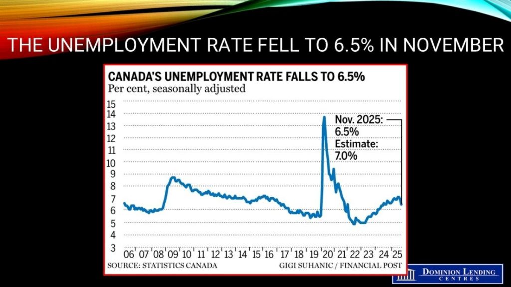 The unemployment rate dropped 0.2 percentage points to 6.9% in October, down from 7.1% in August and September—the highest since May 2016 (except for pandemic years). Furthermore, Statistics Canada’s labour force survey shows the unemployment rate fell to 6.5% last month, the lowest since July 2024 and down from 6.9% in October. It’s the most significant percentage-point change in the unemployment rate since 2022.