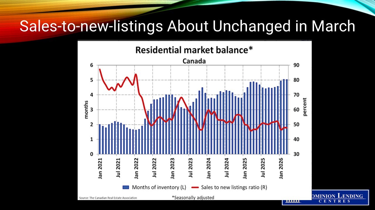 With new supply and sales both little changed in March, the national sales-to-new listings ratio remained at 47.8%. The long-term average for the national sales-to-new listings ratio is 54.8%, with readings generally between 45% and 65% that are consistent with balanced housing market conditions.