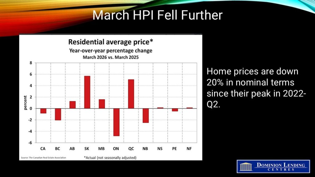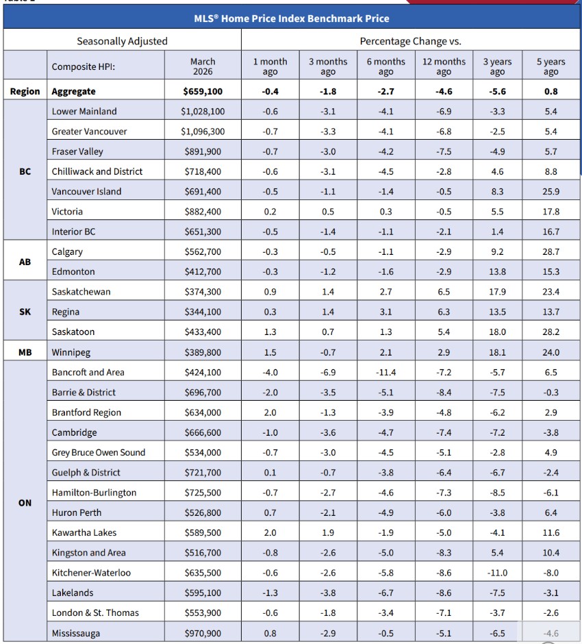 “Home sales activity remained at lower levels in March, as rising global economic uncertainty, along with a mid-month jump in fixed mortgage rates tied to incoming higher inflation, piled on to an already shaky economic start to the year,” said Shaun Cathcart, CREA’s Senior Economist. “2026 is still expected to see a modest amount of upward momentum in sales and a stabilization in prices as some pent-up first-time buyer demand enters the market, but the forecast for the year has had to be revised downward. The timing of higher mortgage rates, along with the perception they may be temporary, could keep would-be buyers away at the most active time of year – April, May, and June – as they wait for rates to come back down.”