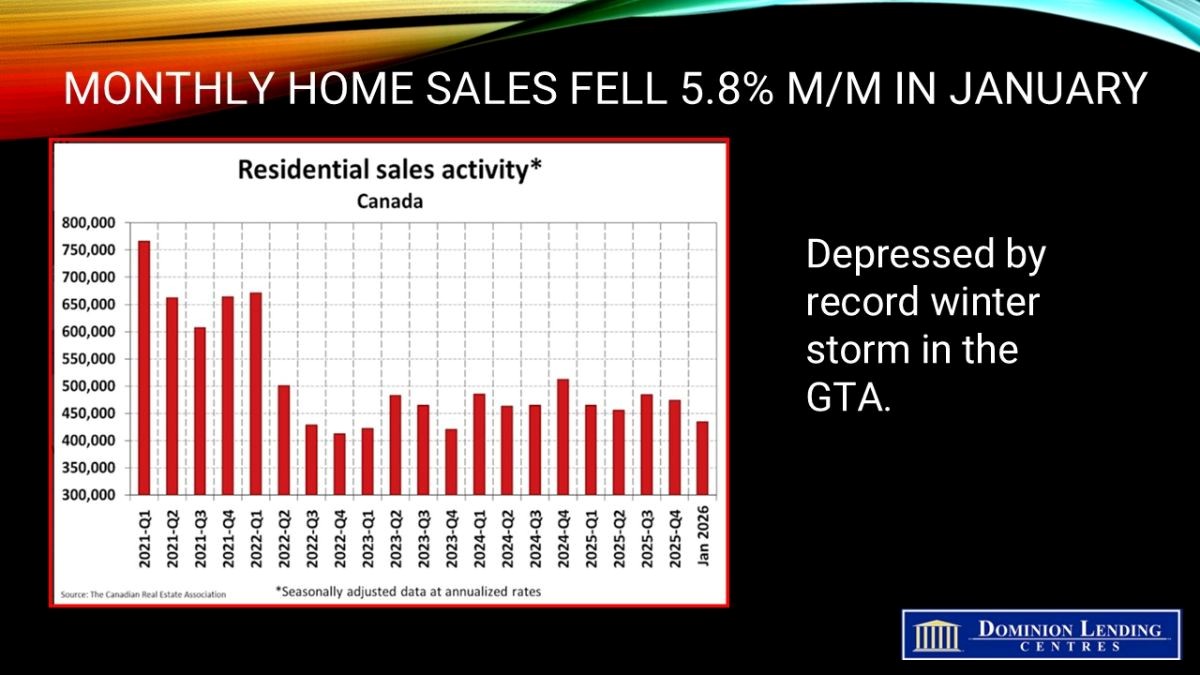 Canadian home sales fell 5.8% m/m in January, depressed by record winter storm in Ontario