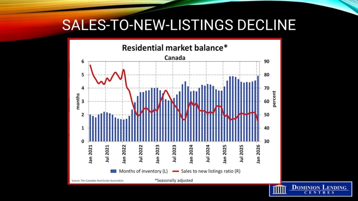 With a rare combination of a sizeable increase in new listings and a sharp slowdown in sales in January, the national sales-to-new listings ratio dropped to 45% compared to 51.3% at the end of 2025. The long-term average for the national sales-to-new-listings ratio is 54.8%, with readings generally between 45% and 65%, consistent with balanced housing market conditions.