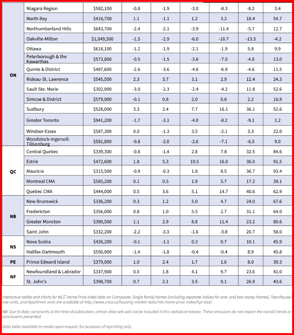 Regionally, prices remain down year over year in British Columbia, Alberta, and Ontario, offsetting gains in other provinces. An analysis by city shows the largest year-over-year declines dip into double digits in Hamilton-Burlington and Oakville-Milton, contrasted with double-digit gains in Sudbury, Quebec City, and St. John’s, Newfoundland.
