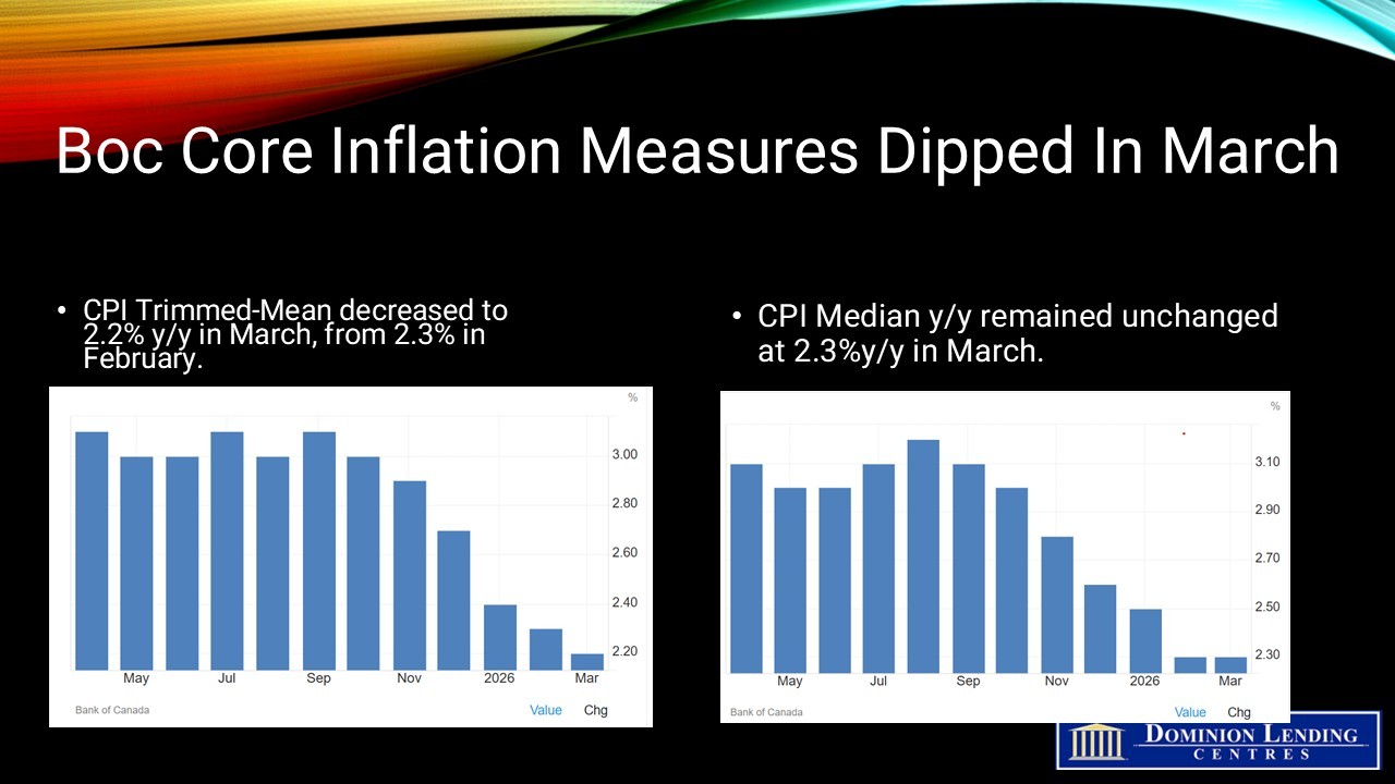 The headline inflation rate in Canada surged as expected with the War in Iran and the resulting oil price shock. The inflation rate hit 2.4%, up from 1.8% in February, tying for the highest in a year but a bit below market expectations of 2.5%. The surge reflected the initial impact of the war in the Middle East on Canadian consumer prices, as disruptions to tankers from the Persian Gulf triggered energy shortages worldwide. The consumer energy inflation swung to 3.9% from the deflation rate of 9.3% in the previous month, enough to raise transportation inflation to 3.7% (vs -0.8% in February). In turn, prices accelerated for shelter (1.7% vs 1.5%) and recreation and education (2.6% vs 0.5%). Meanwhile, base effects from the reintroduction of GST/HST taxes continued to impact food inflation, which fell to 4% from the 5.4% in February. The CPI rose 0.9% from the previous month, driven by a 21.2% surge in gasoline prices. Excluding gasoline, the CPI rose at a slower year-over-year pace in March (+2.2%) than in February (+2.4%). The CPI was up 0.9% month-over-month in March. On a seasonally adjusted monthly basis, the CPI increased 0.5%.