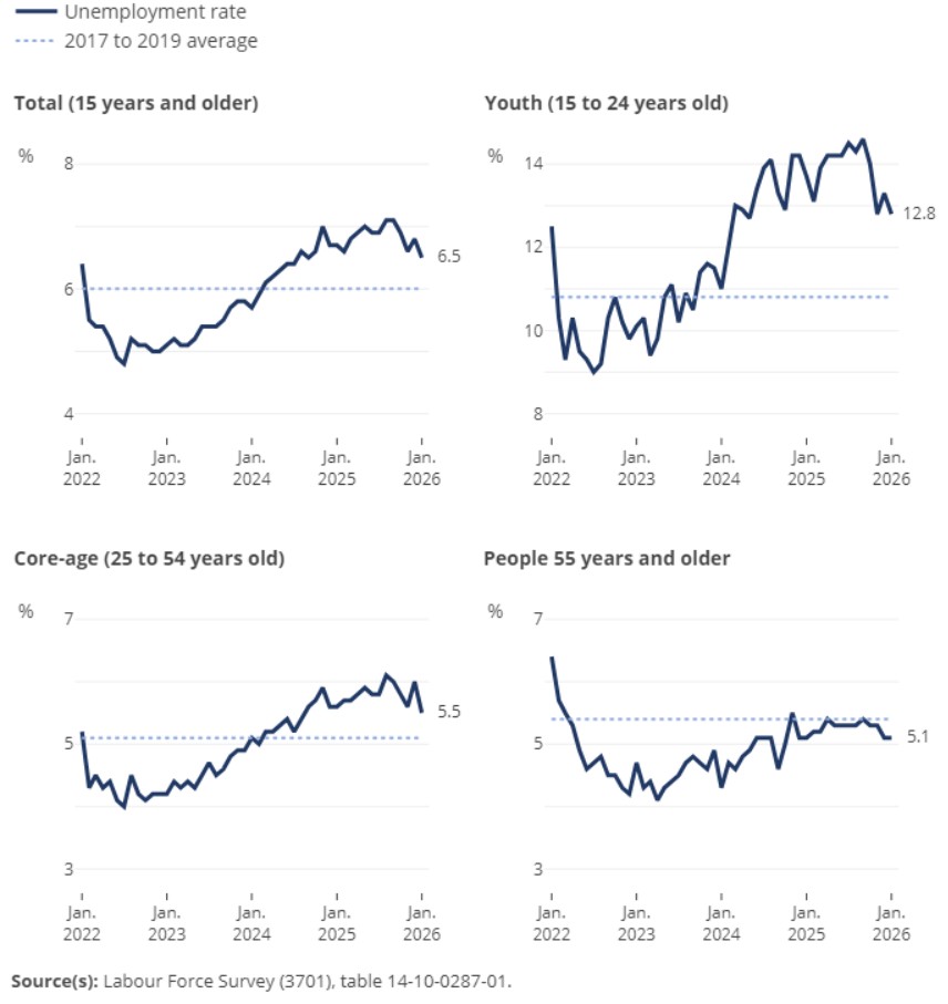 The labour force participation rate—the proportion of the population aged 15 and older who were employed or looking for work—decreased 0.4 percentage points to 65.0% in January, following an increase of 0.2 percentage points in December. The decline in January was concentrated in Ontario, the hub of the auto sector, manufacturing generally, and steel production. Recent data also show that the number of entry-level positions has fallen sharply, likely due to artificial intelligence replacing these positions.